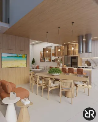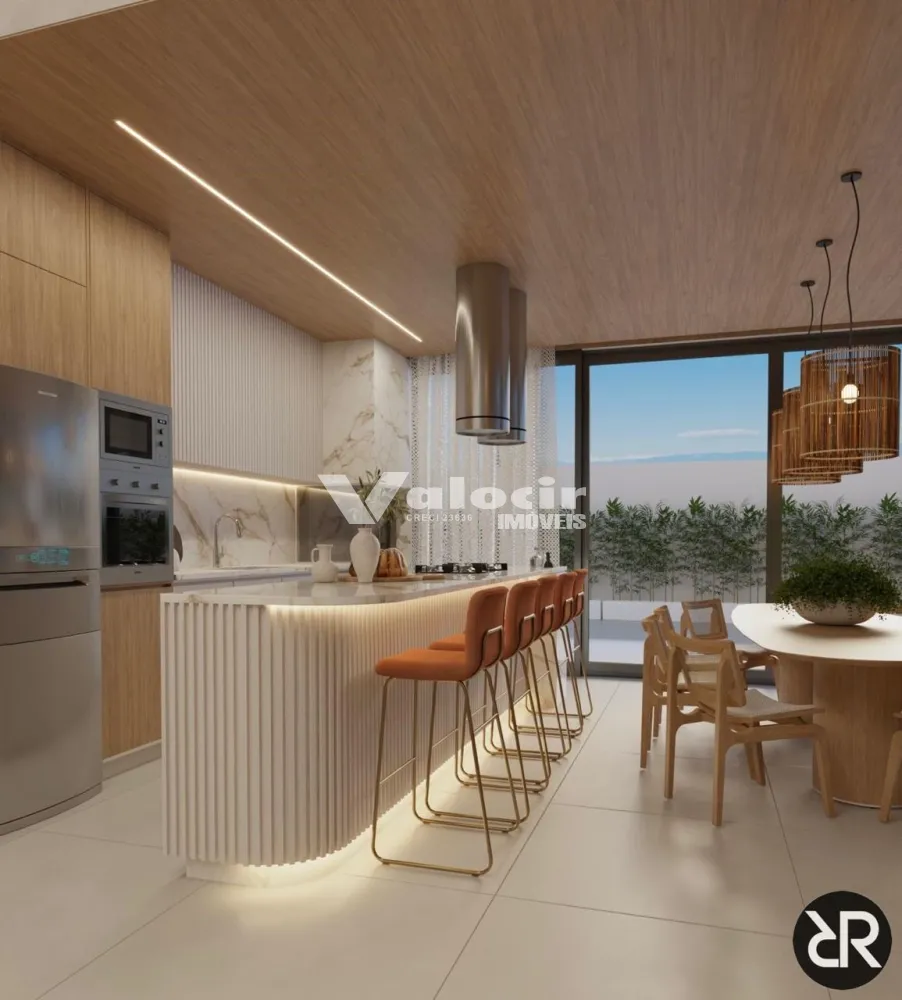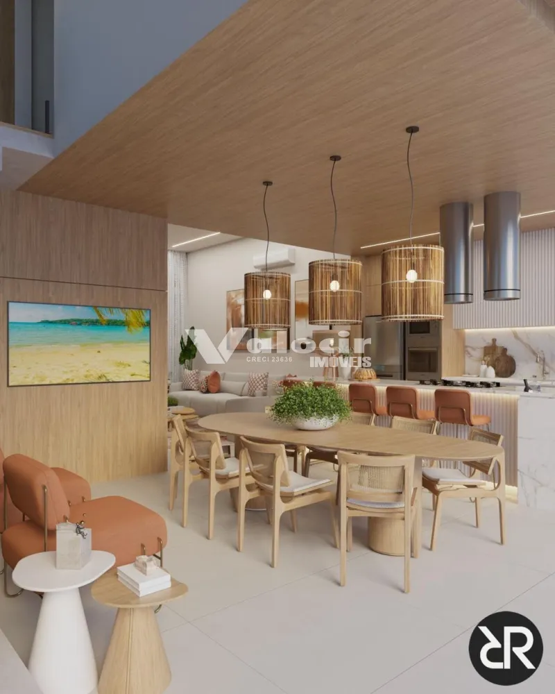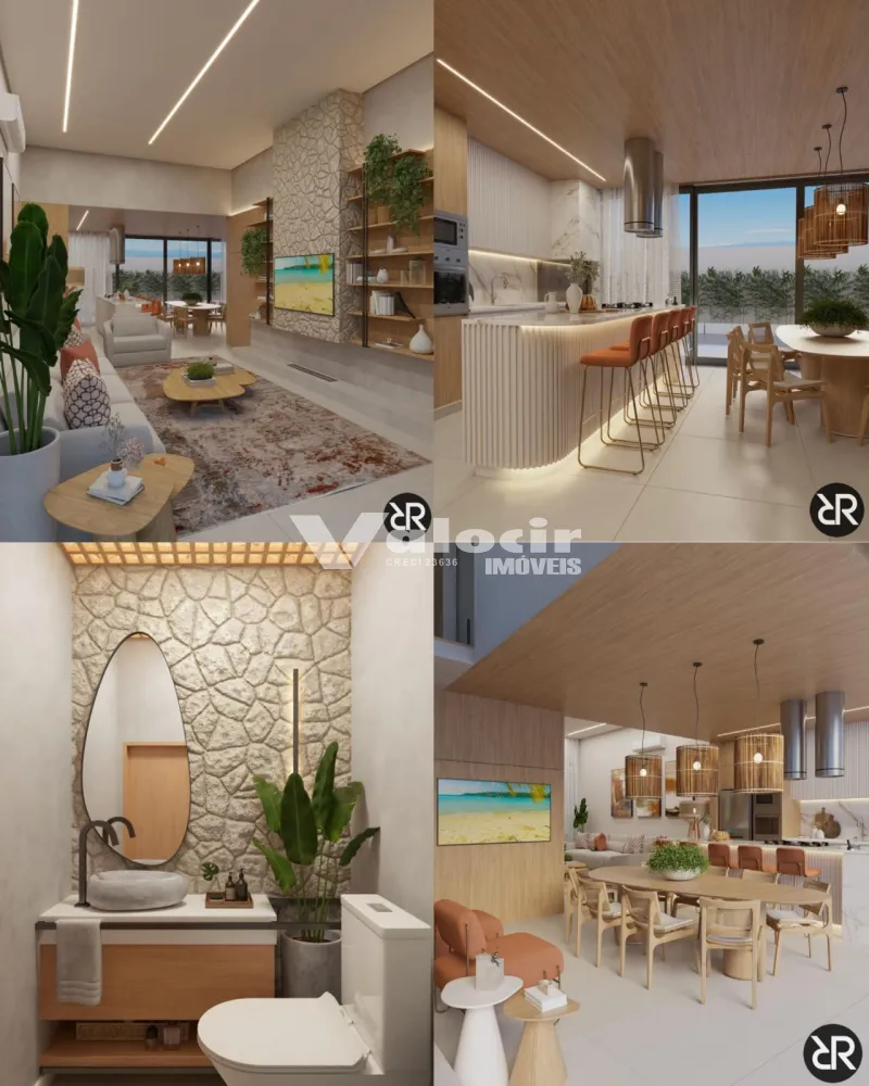 Espaços fluidos e multifuncionais: cozinha gourmet integrada à sala, área gourmet coberta e suítes privativas